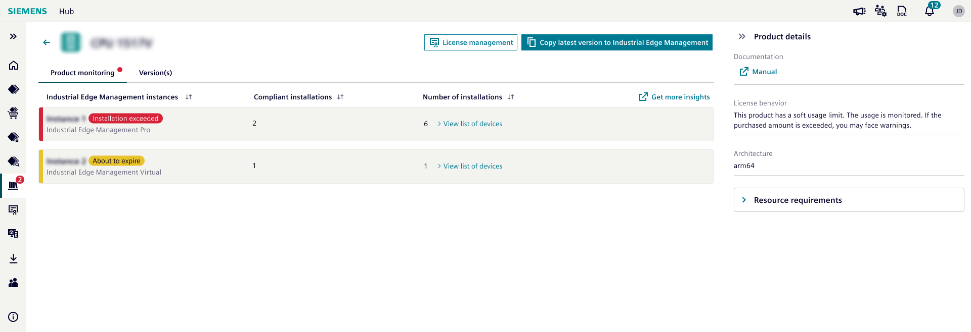 Industrial Edge Hub shows compliance warnings if number of installations / onboarding / enablement is more than number of licenses assigned to Industrial Edge Management or Industrial Edge Device.